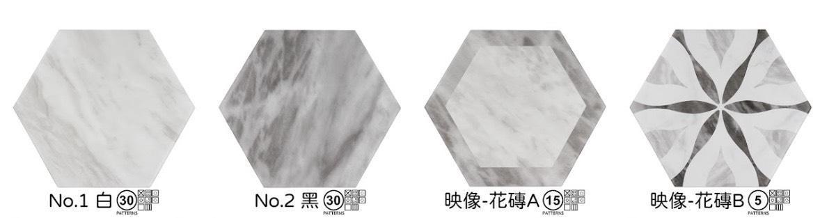 商品詳情 品名:映像 六角磚 (霧面) 四款:NO.1白、NO.2黑、花磚A、花磚B 模面 : NO.1白(30個模面)、NO.2黑(30個模面)、花磚A(15個模面)、花磚B(5個模面) 規格:17.5*20*0.85CM 88片/坪 產地:西班牙 映像 六角磚